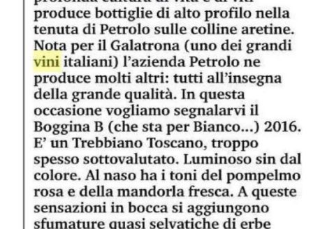“…Bòggina B (che sta per Bianco…) 2016. E’ un trebbiano Toscano, troppo spesso sottovalutato. Luminoso sin dal colore. Al naso ha i toni del pompelmo rosa e della mandorla fresca. A queste…